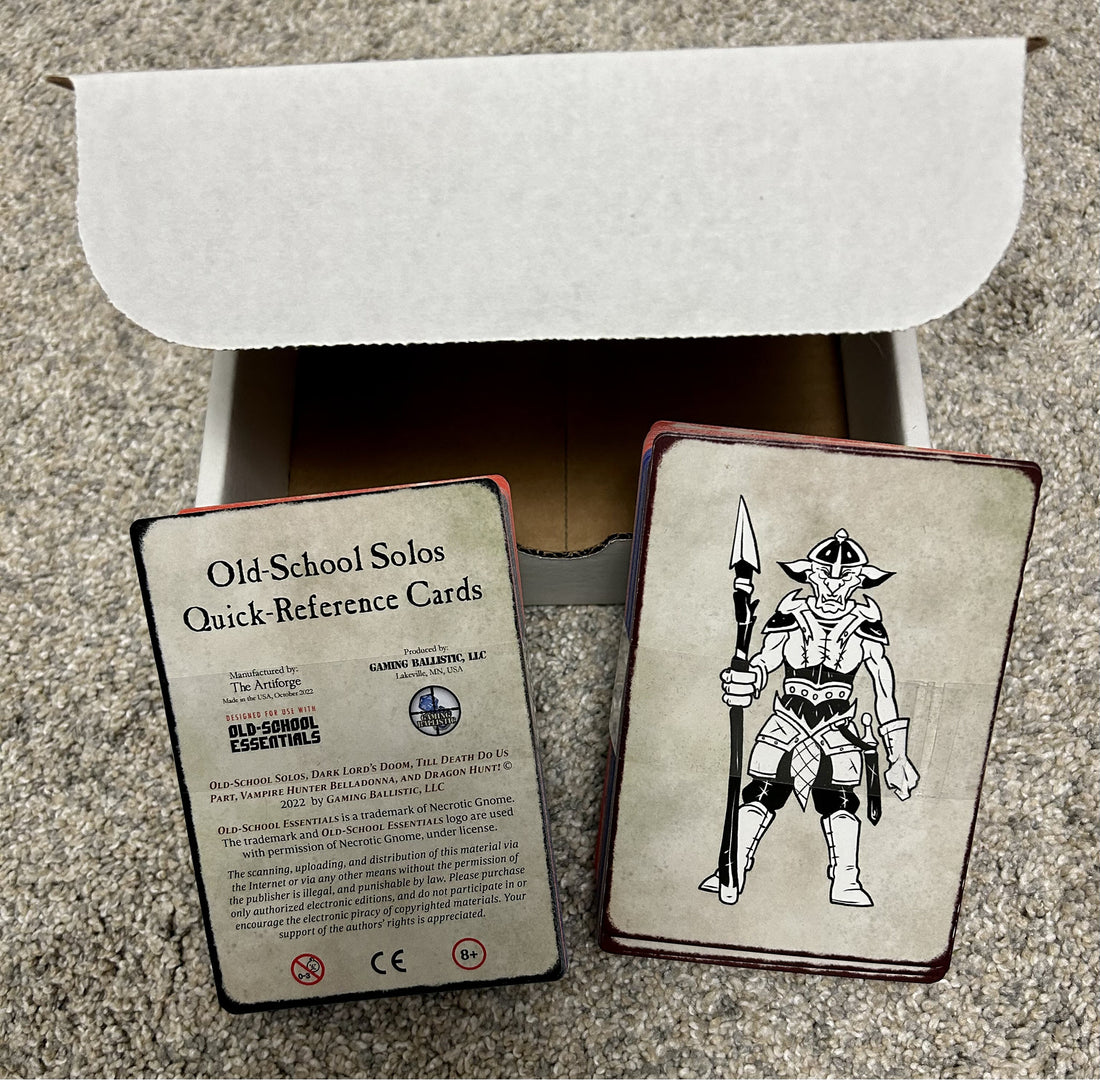 A deck of 184 reference cards for the monsters and rules in the four OSE Solo adventures. Complicated creatures - like dragons and vampires - have a second card listing the common abilities for all such creatures.